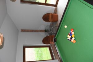 Tak, to prawda mamy przy angoAGROTURYSTYCE oddzielny budynek z salą bilardową. Kamienny stół bilardowy jest 3 – funkcyjny. Można go przykryć wg zapotrzebowania nakładką do ping – ponga lub nakładką do cymbergraja. Dla osób towarzyszących parze grających oferujemy w tej sali, zamiast planowanego wcześniej fotela do masażu biernego, taśmy TRX do czynnych ćwiczeń z masą własnego ciała i twistery modelujące talię i kręgosłup. Można też tu spokojnie odpocząć przy stoliczku obserwując grających czy też migające płomyki w kominku. Dodatkowo jeszcze informuję, że takie taśmy TRX znajdują się też na naszym boisku sportowym, a twistery w sali fitness w angloAGROTURYSTYCE.
